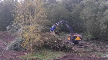 Vanwege de extreem lage waterstand in het gebied is, eerder dan gepland, begonnen met het laatste deel van het zaagwerk. Zaagwerk van formaat, zowel wat beplanting als machines betreft.
