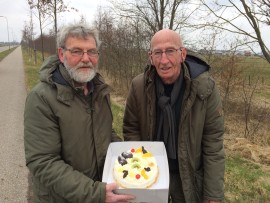 Jan kreeg uit de handen van Gijs van den Brink een verse slagroomtaart overhandigd.